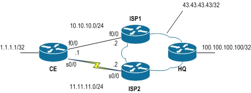 *Mar 1 00:48:35.859: %TRACKING-5-STATE: 10 rtr 20 state Up->Down CE#sh ip route | beg Gateway Gateway of last resort is 11.11.11.2 to network 0.0.0.0 1.0.0.0/32 is subnetted, 1 subnets C 1.1.1.1 is directly connected, Loopback0 10.0.0.0/30 is subnetted, 1 subnets C 10.10.10.0 is directly connected, FastEthernet0/0 11.0.0.0/30 is subnetted, 1 subnets C 11.11.11.0 is directly connected, Serial0/0 S* 0.0.0.0/0 [253/0] via 11.11.11.2