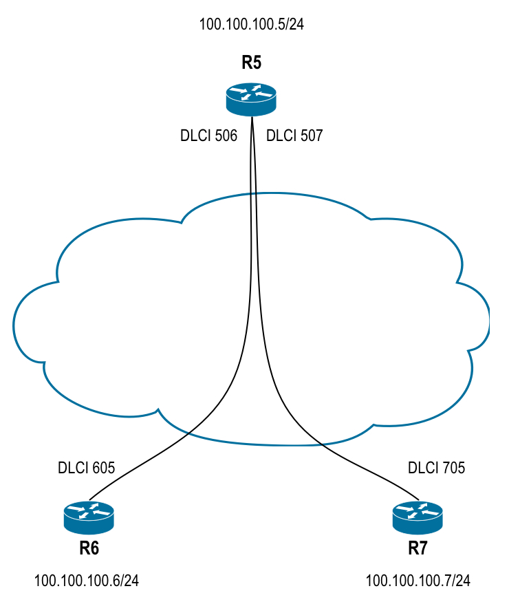 R5#sh run int s0/0 ! ! interface Serial0/0 ip address 100.100.100.5 255.255.255.0 encapsulation frame-relay ip ospf priority 100 clock rate 2000000 frame-relay map ip 100.100.100.6 506 broadcast frame-relay map ip 100.100.100.7 507 broadcast end R5#sh run | beg router ospf router ospf 1 log-adjacency-changes network 0.0.0.0 255.255.255.255 area 0 neighbor 100.100.100.6 neighbor 100.100.100.7 !